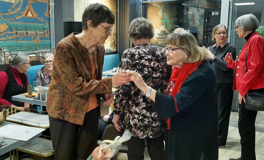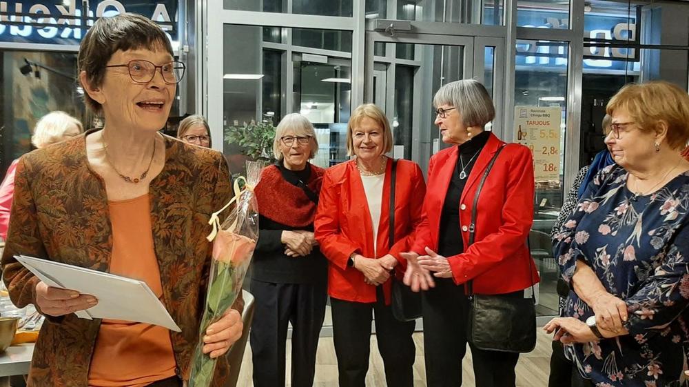 Sirkka Ali-Raatikaiselle ojennettiin juhlassa Harraste Marttojen ansiomerkki.